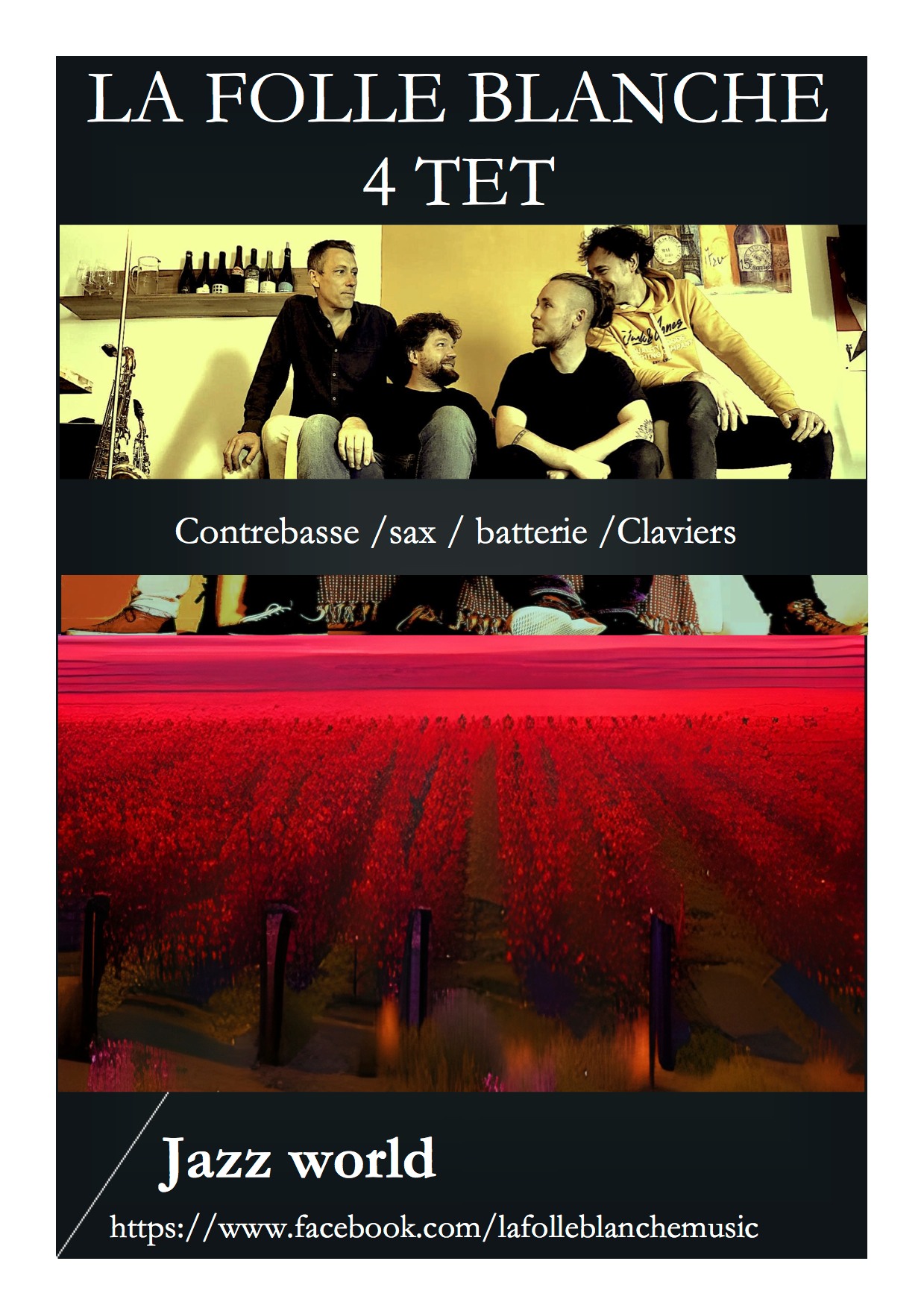 LA FOLLE BLANCHE / 4tet Publié le jeudi 28 mars 2024 à 09h56 La Folle Blanche 4tetQuartet La Folle Blanche travaille actuellement sur un nouveau répertoire, jazz, world et d'autre choses encore . Album en préparation .. à voir et à entendre : https://www.youtube.com/watch?v=21HGUfDSdhQ